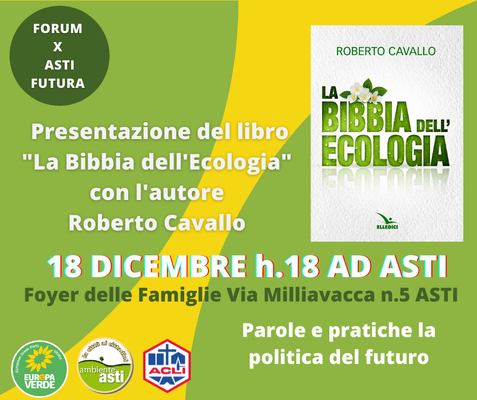 Sabato 18 dicembre alle ore 18, presso il Foyer delle Famiglie, proseguono gli incontri del Forum per Asti Futura promossi da Ambiente Asti per progettare la città del futuro.L’incontro nato in collaborazione con le Acli provinciali di Asti e con Europa Verde.”Quello che vogliamo è offrire strumenti a cittadini, associazioni, a chi amministrerà la città per una politica sia come impegno personale che pubblico”Il libro di Roberto Cavallo, che richiama già i contenuti ecologici all’interno della Bibbia, è anche un manuale pratico per chi vuole impegnarsi per un vero cambiamento ecologico che passa attraverso politiche “green”, stili di vita ecologici.